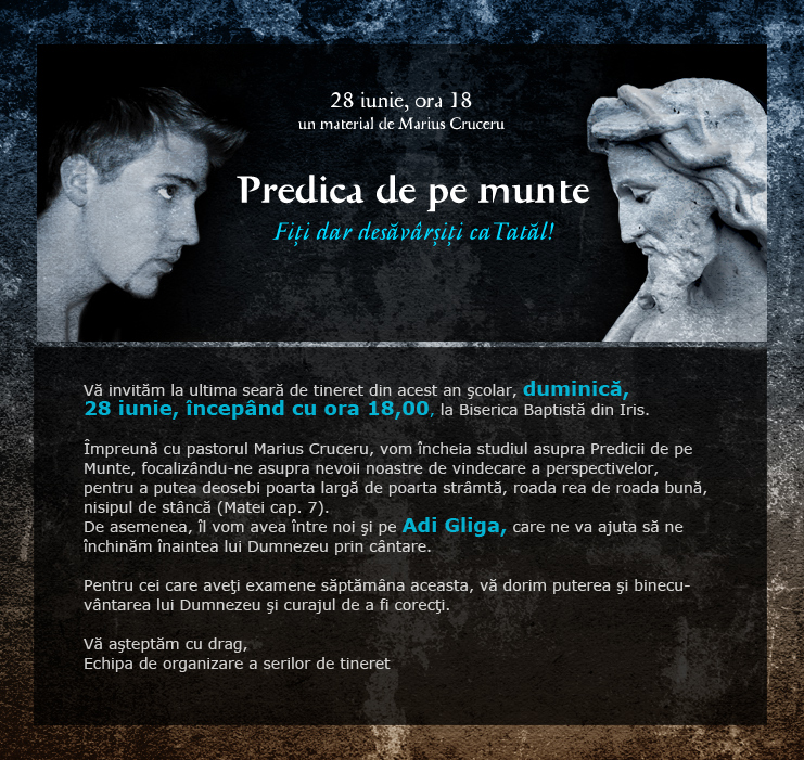 Duminică seara, împreună cu Adi Gliga, vom participa la o seară de închinare și studiu, ultima seară pe care o petrecem în Predica de pe Munte.