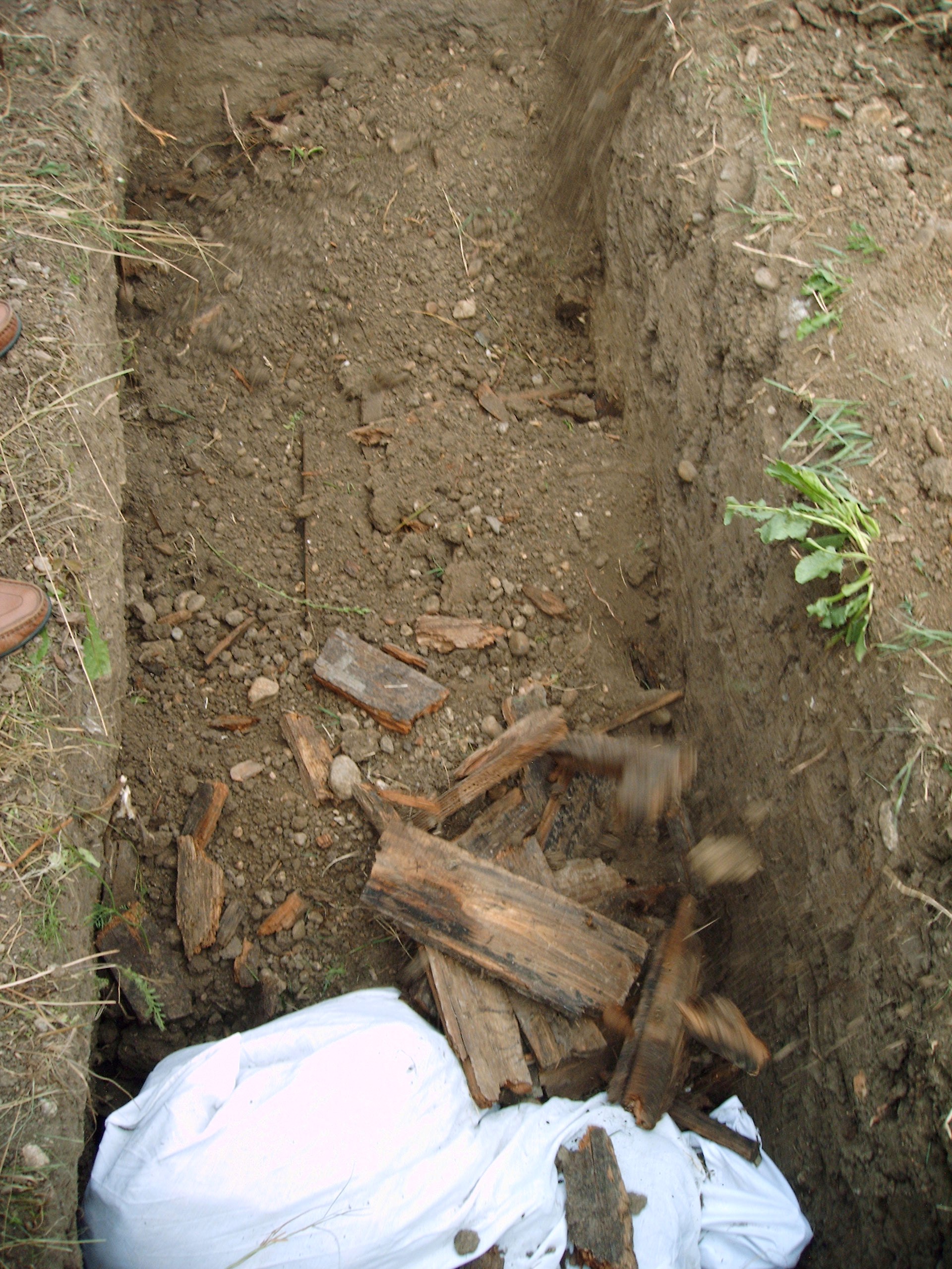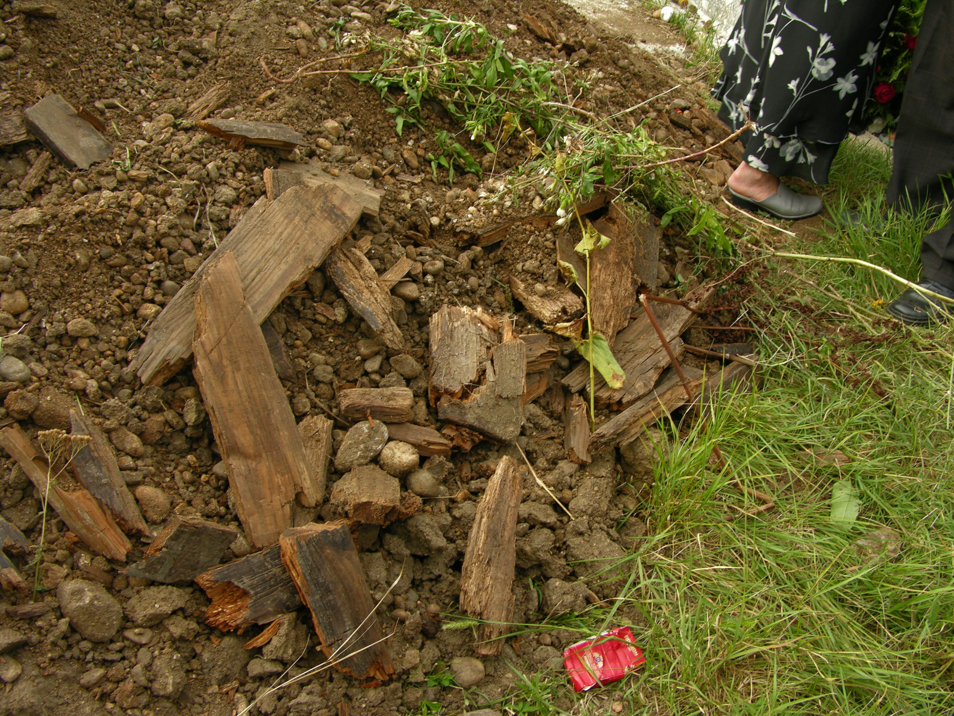 Groparii au terminat de săpat. Se vede scîndura neagră, putrezită a coşciugului vechi de 33 de ani.