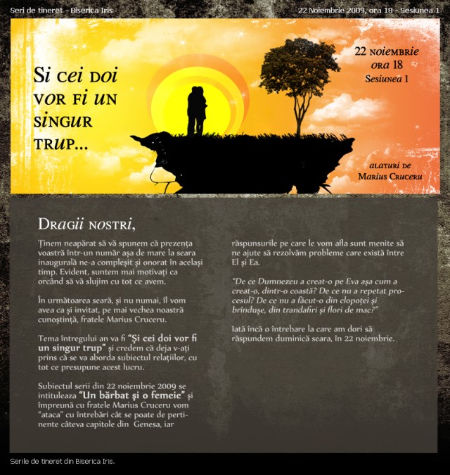 Nici o întâmplare nu este întâmplătoare… Am fost obligat sa stau acasa in aceasta Duminica (desi de regulă ma întâlnesc de obicei în fiecare Duminică cu cei din biserica locală din care fac parte). Am urmărit astfel începutul acestor mesaje despre familie; şi sunt foarte încântat de nivelul ridicat al discursului şi de competenţa vorbitorului. Deşi nu voi putea urmări mereu aceste discursuri, aş fi foarte încântat să cumpăr un material tipărit care să conţină esenţa lor. Vă mulţumesc anticipat.