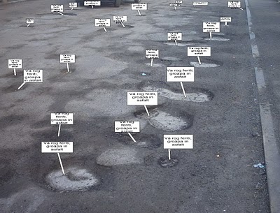 De doi ani ma tot pregatesc pentru o un „moment artistic” pe drumurile patriei. Poate ne asociem mai multi si impanzim tara cu aceasta idee. Doresc sa ma imbrac in costum national sau zonal, sa-mi fac rost de o caruta, niste pamant, sa-mi golesc camara de cartofi si sa merg pe un tronson (ca cel din imagine) si sa ma fac util umpand gropile cu pamant si cartofi, dupa care sa le semnalizez ca atare (ATENTIE! cultura de cartofi).