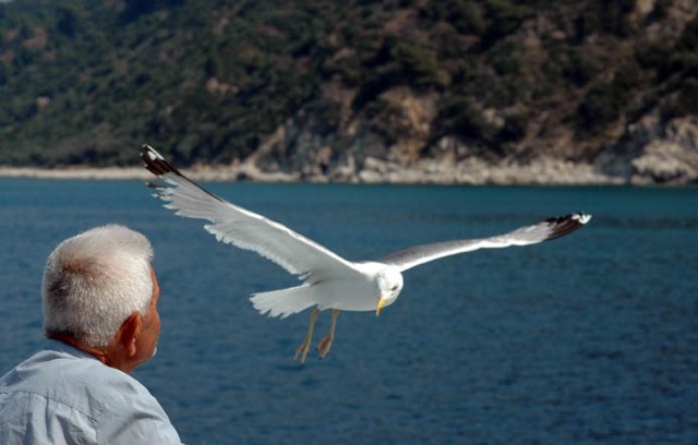 Pescarusul se uita la om, omul la pescarus. Si cadrul e bine prins, ca proportie uscat-mare, dar mi se pare interesant cum se uita unul la celalalt, parca ar fi imortalizat exact momentul intalnirii privirilor. Dar… probabil ca pescarusul se uita dupa ceva mancare… 🙂