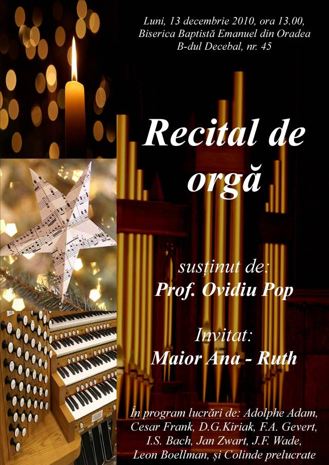 Biserica Creştină Baptistă Emanuel din Oradea a achiziţionat o orgă nouă. Luni, în 13, la 13.00, are loc un minirecital de orgă clasică. Nepoata noastră, Ana-Ruth Maior, mistuită de pasiune pentru orgă, va cînta cîteva bucăţi, alături de Ovidiu Pop, profesor la Liceul Emanuel şi preparator la Universitatea Emanuel.