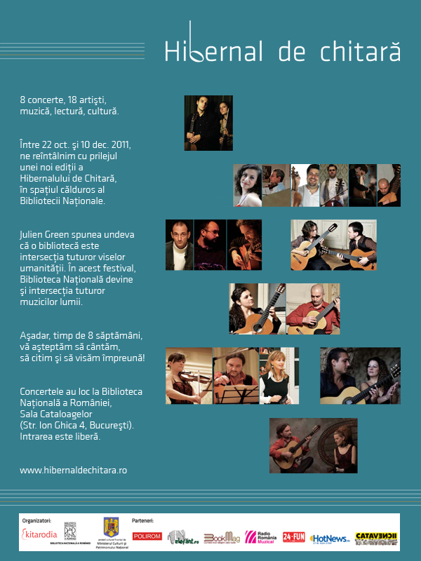 8 concerte, 18 artişti, muzică, lectură, cultură. Aceasta este invitaţia pe care o lansează Hibernalul de Chitară ce se deschide pe data de 22 octombrie 2011 la Biblioteca Naţională. Timp de 8 săptămâni, publicul este aşteptat să ia parte la agapele muzicale de sâmbătă seara, care propun un program variat, cu muzică veche, muzică de cameră, muzică electronică, flamenco, poezie, triluri de privighetoare şi acorduri de chitară.