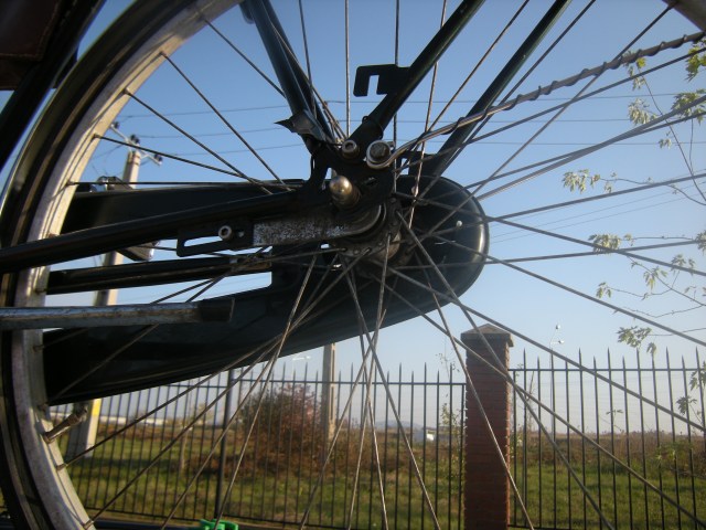 Cauciucurile, destul de uzate, sînt reflectorizante lateral. Roate de 28 de inches, așa cum am dorit. Pasul mare, angrenajul foarte bine reglat. Bicicleta merge foarte lin și are o înălțime amețitoare. Foile și pedalele au fost shimbate și ele, pentru că macaralele pedalierului era fiecare de la altă bicicletă, una de la mountain bike, cealaltă de la o bicicletă de oraș. Axul pedalier este pe pătrat.