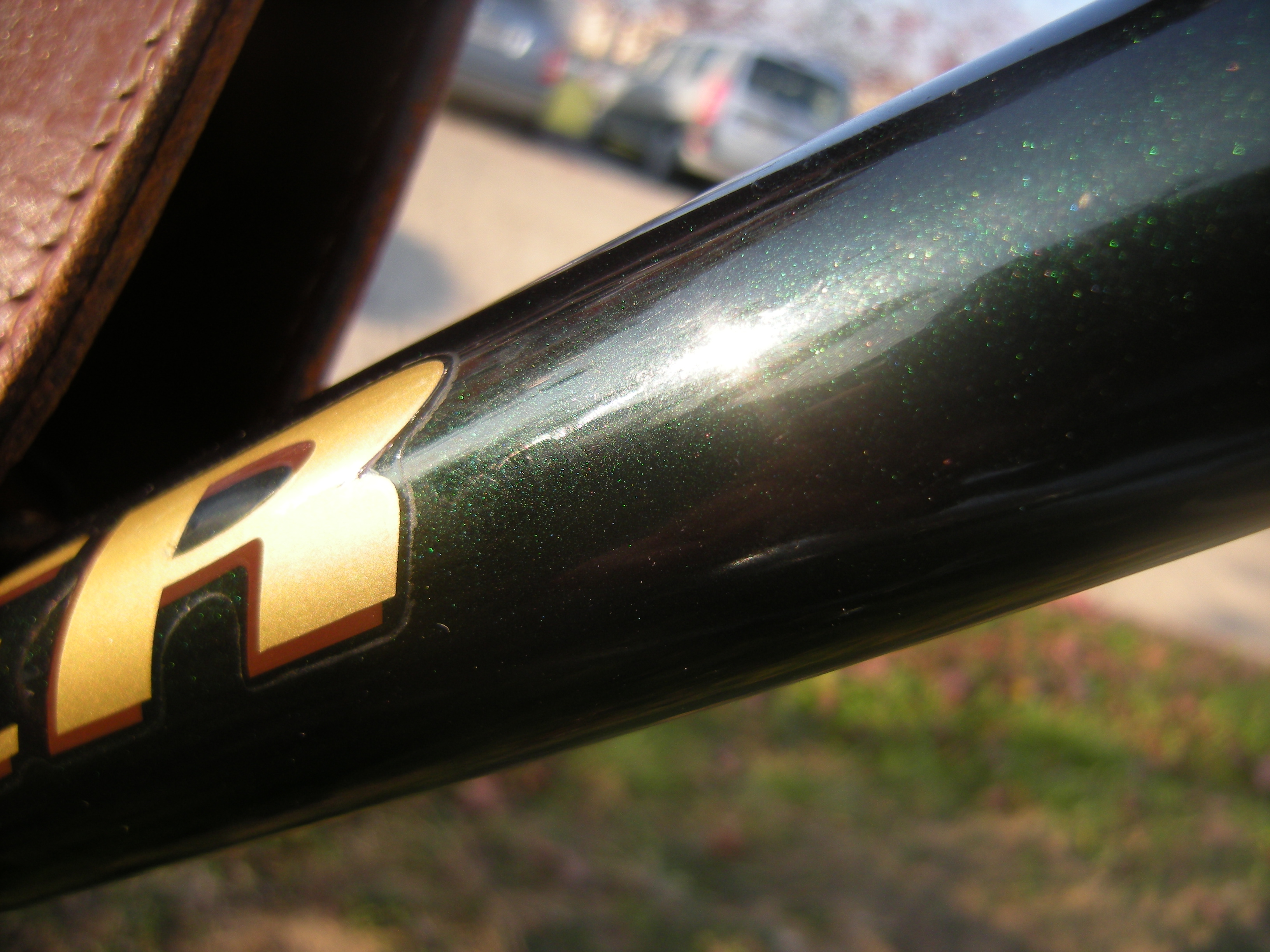 Cadrul este un Ranger olandez luat din Zărnești-Tohan, culoarea pare neagră, dar este un verde sienna foarte profund. Am ales această localitate să iau biciccleta pentru că nu am găsit un Tohan autentic în stare relativ bună și, chiar dacă aș fi găsit, sablarea și revopsirea nu îl așteptau pe bătrîn, apoi nu se compară calitatea acestui cadru crom-molibden cu cele de oțel vechi.