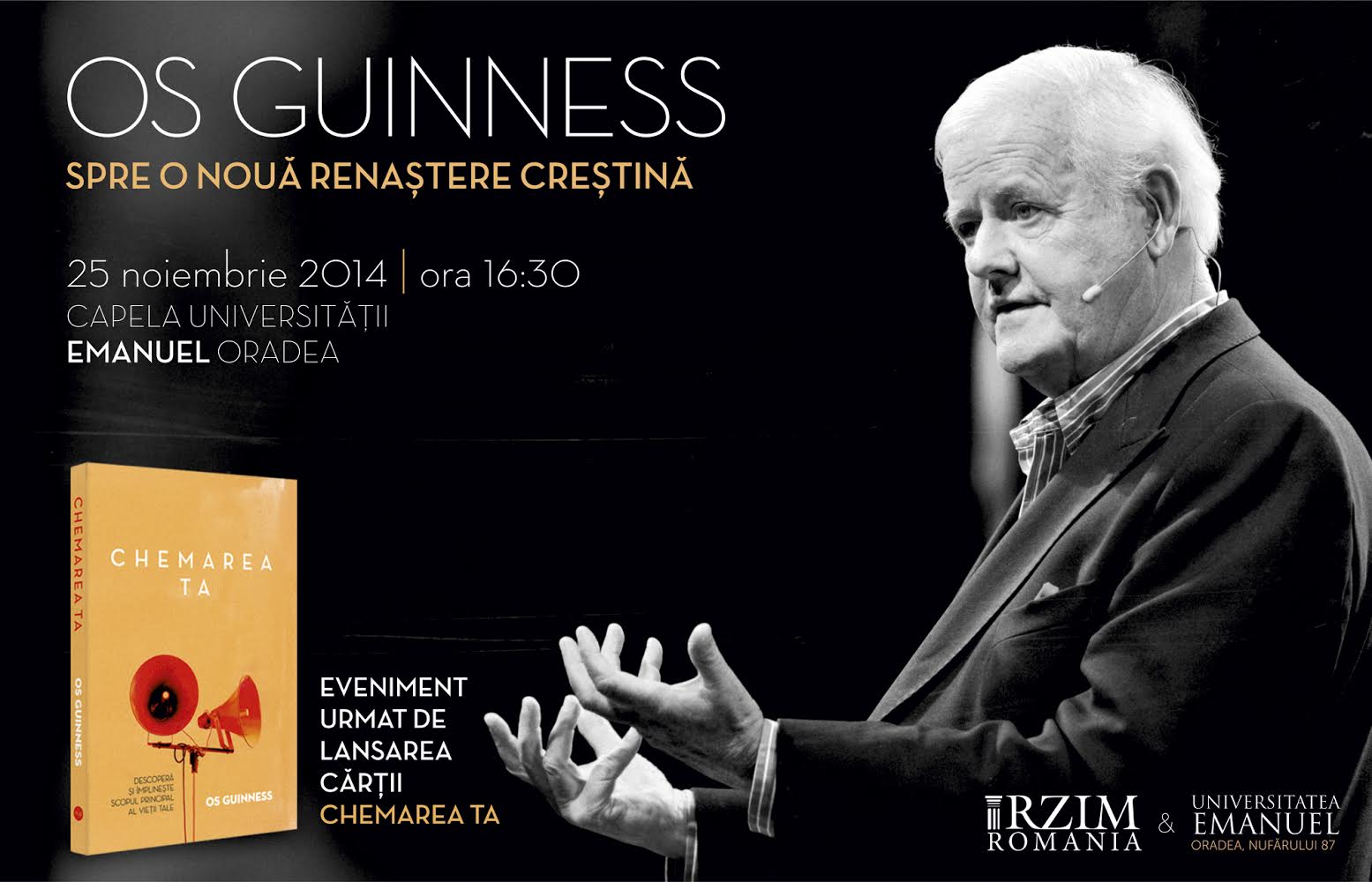 Prelegerea susținută de Dr. Guinness, intitulată ”Spre o Renaștere creștină”, va fi urmată de lansarea cărții ”Chemarea ta” (Arad: Neword Press, 2014) în prezența autorului. Le mulțumim celor de la Universitatea Emanuel din Oradea pentru găzduire și vă așteptăm cu drag!