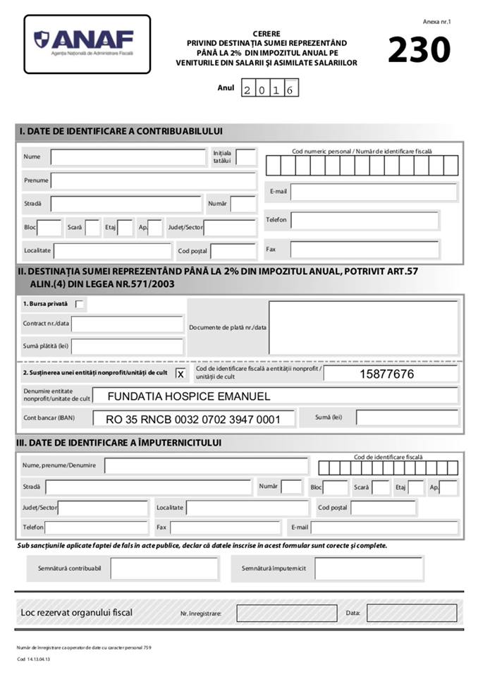 Pentru 2017 nu aveti formularul in format electronic? Sintem citiva colegi care dorim sa redirectionam 2% catre Hospice Emanuel.