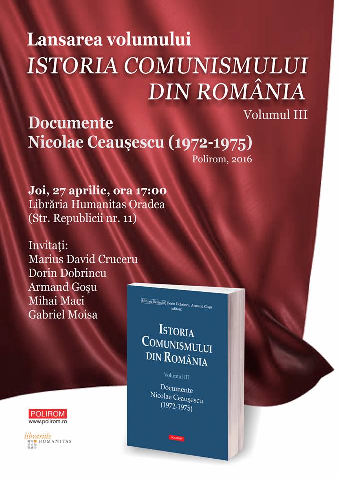Istoria comunismului din România”, vol. III, „Documente Nicolae Ceaușescu (1972-1975) se lansează joi, 27 aprilie 2017, la Oradea, Librăria Humanitas. Vorbitori: Marius Cruceru, Mihai Maci, Gabriel Moisa, Armand Gosu și subsemnatul. Sunteți bineveniți, prieteni din Oradea!