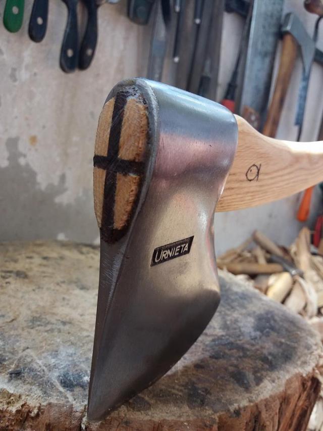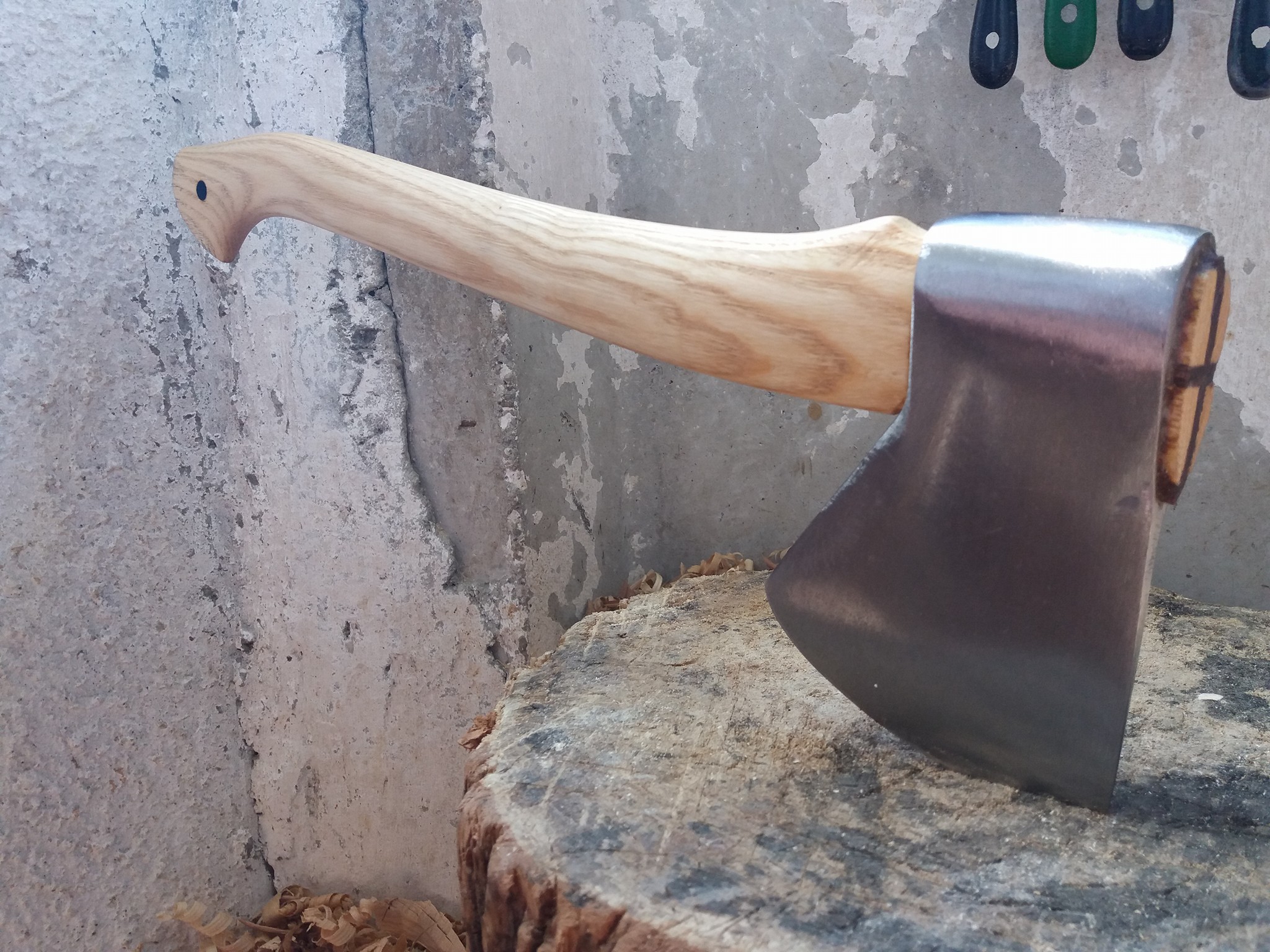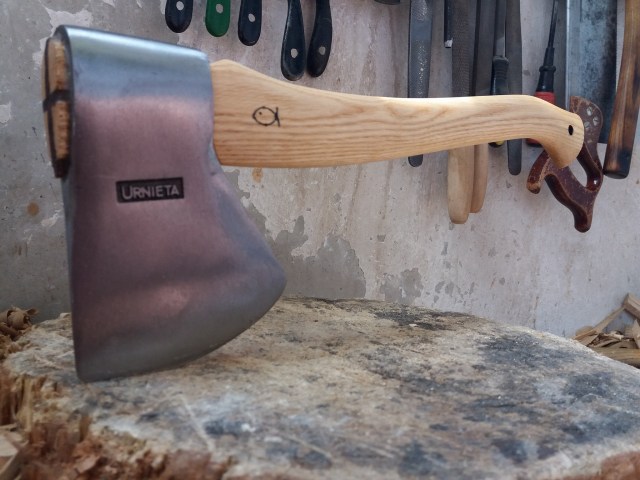 Meșterul pune cozi, pe care le modelează și le șlefuiește impecabil. Sînt ușor de prins, nu aluncă din mînă, sînt comode la mișcare. L-am și încercat pe acesta pe care îl vedeți mai jos! Am spart destul de multe lemne la viața mea pentru un fiu al asfaltului și am tăiat din pădure destul pentru un copil al junglei de beton, orașul. Cred că îmi dau seama imediat cînd am în mînă un instrument bun. Toporul acesta este și de panoplie, dacă vreți, și de lucru la greu, dacă doriți.