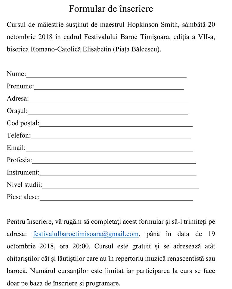 Sâmbătă, 20 octombrie 2018, cu începere de la ora 10:00, în cadrul bisericii Romano-Catolice Elisabetin, Timișoara, maestrul Hopkinson Smith va susține un curs de măiestrie care se adresează atât chitariștilor, cât și lăutiștilor. Participarea este gratuită și se face pe baza completării formularului. Numărul cursanților este limitat.
