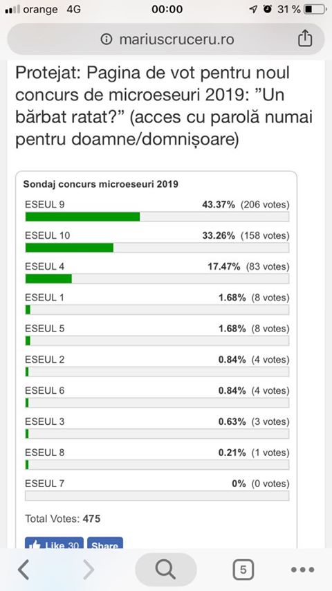 - Premiul să fie transferat totuși către eseul nr. 9, eseu care (fie într-un fel, fie în altul) oricum are cele mai multe voturi, dar nu acest aspect este cel mai important, ci faptul că autorul acestui eseu a venit primul și din proprie inițiativă la mine și mi-a spus că s-ar putea să fie o problemă legată de voturile către eseul său. ”Am motivat mai multe prietene să voteze în dreptul eseului meu și nu cred că acestea au mai citit și celelalte eseuri”. Acest fapt a fost apreciat de mine în primul rînd, apoi de cei care au fost implicați în decizia finală.
